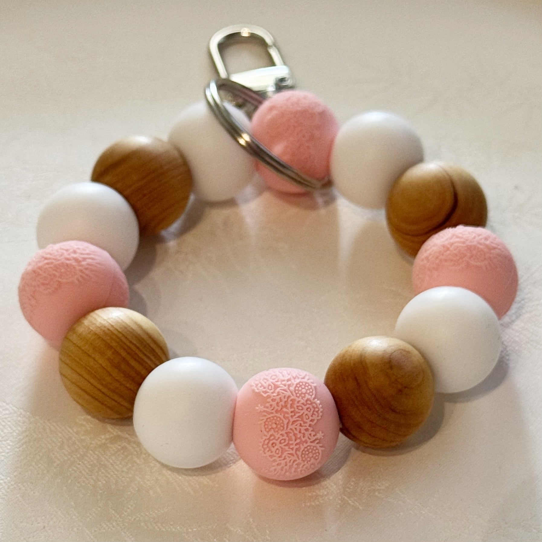 This keyring was made with 4 15mm lace embossed silicone beads, 5 15mm white silicone beads, and 4 15mm sandlewood beads.